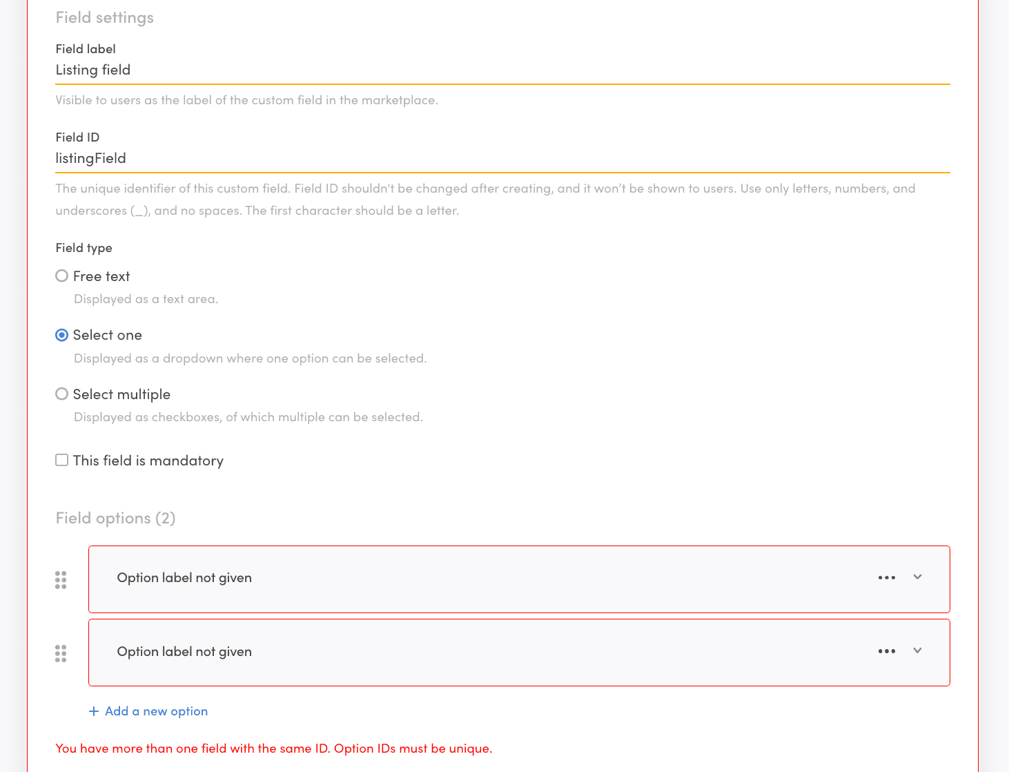 If you then try to add a search schema through Sharetribe CLI for a key and scope that already exists in a Console-originated listing field, you will see the following error: