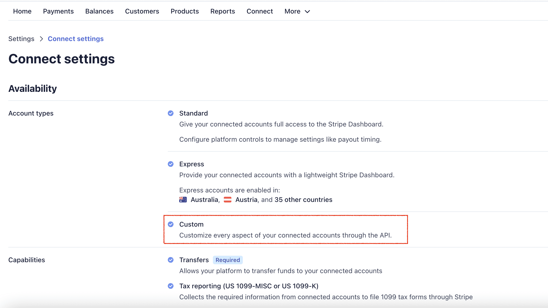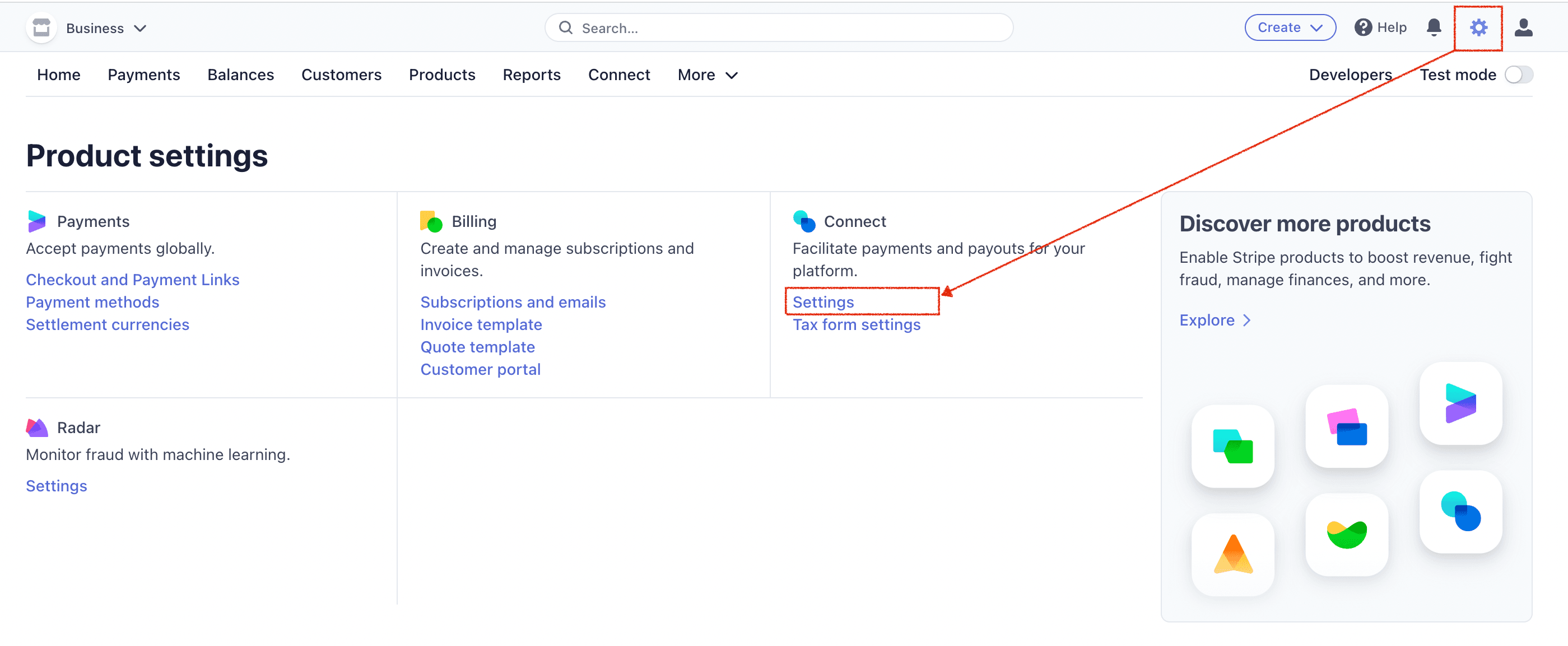 Now when you click the gear icon on the top bar to go to Settings at https://dashboard.stripe.com/settings, you will see a new Connect section. Click Settings in that section.