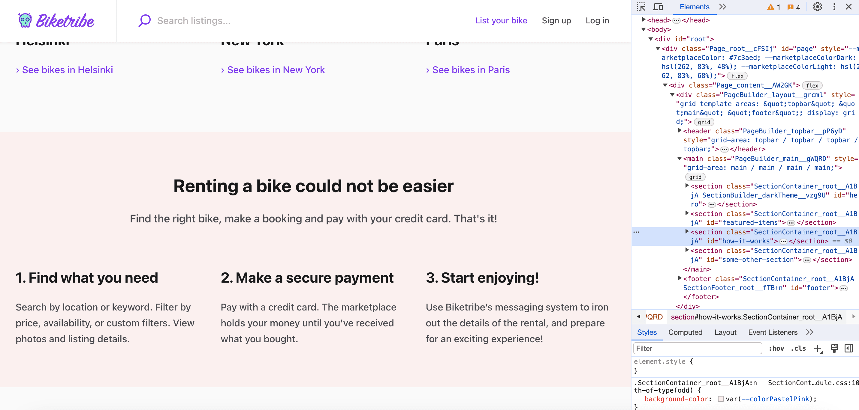 In this tutorial, you learned how to style components in the Sharetribe Web Template using CSS Modules. The tutorial guided you through identifying the desired component using browser developer tools, locating its corresponding CSS file, and making changes to customize the background color. By following this tutorial, you now know how to customise and style components and how the template uses the CSS modules library.
